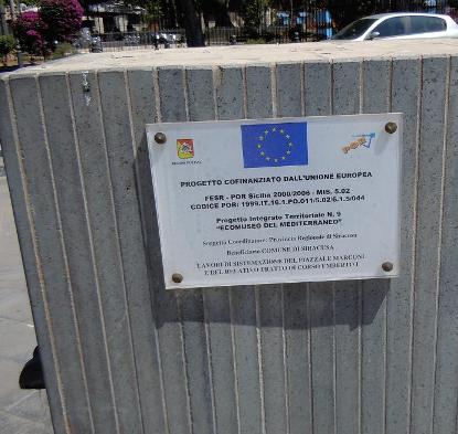 Dieses Schild steht z.B. in Syracusa (Sizilien) auf einem öden, betonierten Platz auf einer Verkehrsinsel, für den die zuvor dort wachsenden Bäume gefällt wurden. Die Ästhetik der Beton-Wasserspiele (für die natürlich keine Geld zum Betrieb vorhanden ist) spricht offensichtlich nur die Hunde von Syracusa an. Ein paar Kilometer weiter sind aber die weltberühmten Höhlen aus römischer Zeit gesperrt, weil kein Geld für die Herrichtung und Sicherung der Fußwege vorhanden ist.