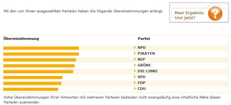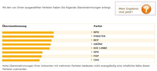 Eine Wahl-o-Mat Probeabstimmung mit einer bewußt recht liberalen Grundhaltung ergibt aber ein verblüffendes Ergebnis, Die beste Übereinstimmung erhält man mit der REP und der Piratenpartei und die geringste Übereinstimmung mit den Altparteien CDU, SPD und FDP, Die Auswahl einer Partei, welche die Interessen eines bestimmten Bürgers am besten vertritt, scheint nicht so ganz einfach zu sein. Der Wahl-O-Mat fragt zu Recht und jetzt?
