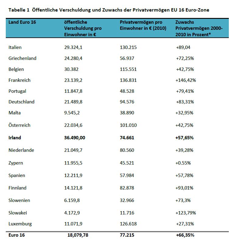 So groß die Beträge für Altschulden und Neuschulden auch sind, so sind sie weit weniger bedrohlich als die Sonderschulden, die ja auch bei der Schuldenbremse in ktitischen Situationen zulässig sind. Doch wann ist die Situation bei den Staatsfinanzen unkritisch? Für Unterstützung der deutschen Banken und Versicherung werden in den nächsten Jahren mehrere hundert Milliarden € benötigt. Die diversen Schutzschirme für andere EU Länder haben auch ein Potential von mehrerern hundert Milliarden €. Dagegen sind die bisherigen Zinszahlungen nur Peanuts. Im Bundeshaushalt 2012 gibt es dafür keinerlei Rückstellungen. Man plant also das alles mit „ungeplanten“ Neuschulden zu bezahlen. Dabei ist eine Unterstützung für Frankreich oder Italien durch Deutschland absolut unsinnig. Die Bürger in beiden Ländern sind nämlich trotz Schulden im Durchschnitt wesentlich reicher als die Deutschen. Das Geld liegt aber als Privatvermögen bei den Bürgern (da gehört es eigentlich ja hin). In Deutschland wurde viel Vermögen durch den Krieg vernichtet und in der ehemaligen DDR auch nicht angespart. Das geringere Vermögen der Deutschen zeigt sich auch bei dem hohen Anteil der Bevölkerung, die zur Miete wohnt (oder die Miete sogar vom Staat bezahlt bekommt) und keinen Immobilienbesitz hat. Interessanterweise spielt die Diskussion um die privaten Vermögen der Krisenländer in der EU Diskussion gar keine Rolle, da die Vermögen in der EU Statistik gar nicht erfasst werden.
