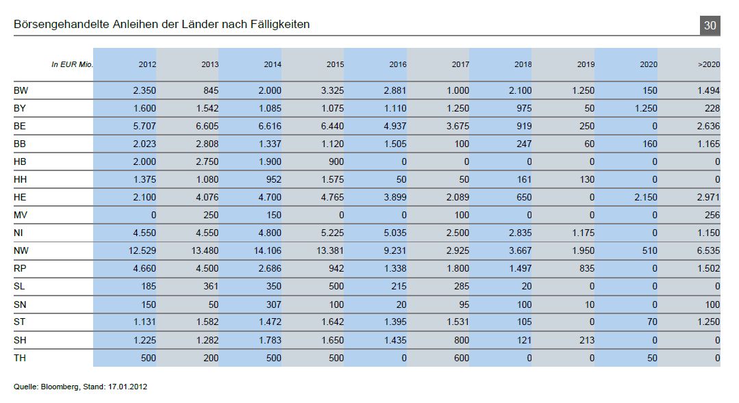 In Deutschland versucht man zur Zeit wenigstens die Gesamtschulden von Bund und Ländern zu identifizieren. Für die Haushalte ist aber wesentlich wann Schulden fällig werden. Schulden werden heute ja nicht zurückbezahlt sondern man nimmt einfach neue Schulden auf. Beispiel für Fälligkeiten der Länderschulden (Quelle: F. Zipfel, DB Research, Verschuldungsstruktur der Bundesländer , Bloomberg)