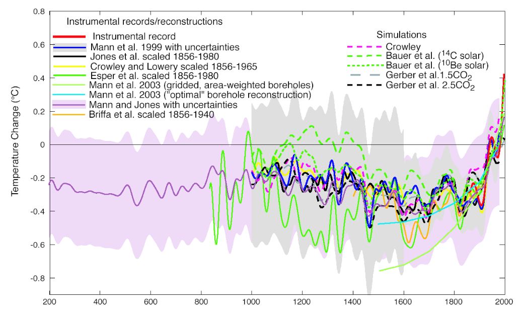 In der History of Temperature Measurements werden die unterschiedlichen Methoden zur Temperaturmessung beschrieben. Selbst Optimisten räumen einen Fehler von > 0.5% der Meßinstrumente ein (http://wattsupwiththat.com/2012/08/30/errors-in-estimating-temperatures-using-the-average-of-tmax-and-tmin-analysis-of-the-uscrn-temperature-stations/). Viel größere Fehler werden aber durch Veränderung durch die Meßmethoden und in der Umgebung der Meßstationen verursacht z.B. ob die Wiese darunter frischgemäht ist oder nicht. In der Sahara konnte man z.B. keine Erhöhung der realen Temperaturen ( Sahara Temperature Trends ) messen. Da ist aber auch die CO2 Konzentration gering, da in der Sahara nur sehr wenig geheizt wird. In der Zeit von 1800 bis 2000 wurden die Methoden der Temperaturmessung und die Zahl und die Platzierung der Meßstationen vielfach geändert. Die Werte werden von verschiedenen Wissenschaftlern unterschiedlich umgerechnet und gewertet (man sollte sich die „wissenschaftliche Diskussion um Meßwerte und Filter mal ansehen).