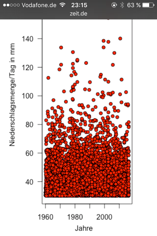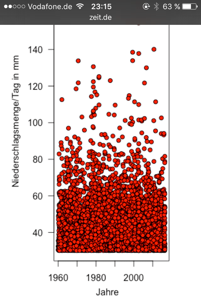 Insgesamt reicht das Datenarchiv des Deutschen Wetterdienstes bis ins 19. Jahrhundert zurück und verzeichnet 75.247 solche Ereignisse. Klingt als ob es heute viel mehr regnet, stimmt aber nicht. Heute wird nur mehr gemessen.