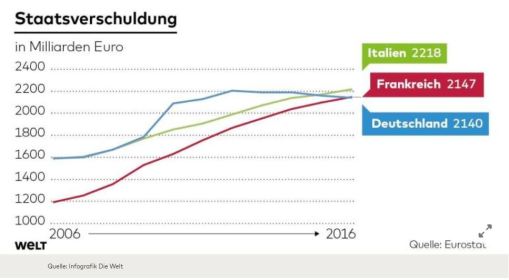 Während Deutschland in den letzten 5 Jahren keine neuen Schulden gemacht hat, befinden sich die großen EU Länder Frankreich und Italien im Schulden-Aufwind. Durch den BREXIT haben die nordischen Länder ihre Sperrmajorität gegen die „lustigen“ Südländer verloren. Deutschland erhält damit nur noch die wichtige Rolle des Zahlmeisters und wird von den EU Grenzländern durch die Drohung mit Flüchtlingen erpresst. Selbst dem „bösen“ Erdogan muß man Waffen und Milliarden zuschieben, damit er keine Flüchtlinge über die Grenze läßt, die er mit seiner Armee vertreibt.