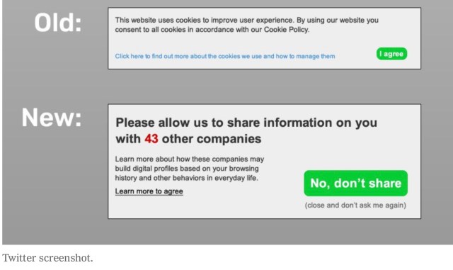 Charlie Warzel von der New York Times beschreibt in einem Artikel wie die übliche Zustimmung zur Nutzung von Cookies durch eine Angabe über die Weitergabe der Daten ergänzt werden sollte. Wer dann noch der vielfachen Verteilung seiner Daten zustimmt ist wohl selbst schuld.