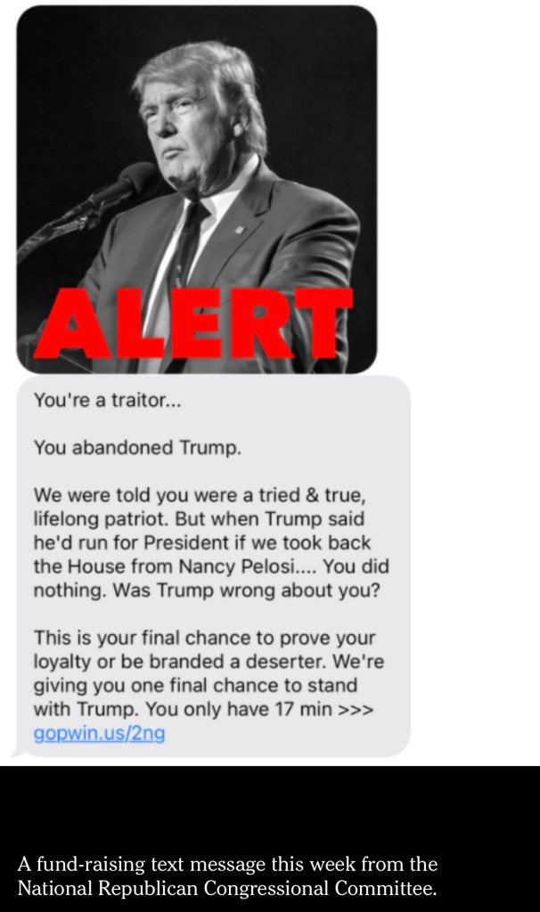 Das Medium der Wahl sind direkte eMails an die Wähler. Ein schönes Beispiel ist die folgende Drückermail der Republikanischen Partei. Wer nicht die republikanischen Kandidaten unterstützt wird als Verräter an Donald Trump gebrandmarkt. Siehst Du jetzt hast Du ein schlechtes Gewissen!