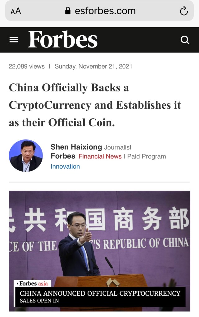 China enwickelt einen Digitalen Yuan aber keine offizielle Crypto Währung. Das ist eine gutgemachte FAKE Nachricht: Deutschland soll eines der ersten Länder sein in dem man die ChinaCoin kaufen kann. Hier soll Elon Musk total begeistert sein. Elon Musk wird sich aber wohl nicht um die paar Millionen kümmern die man mit Coins verdienen kann.