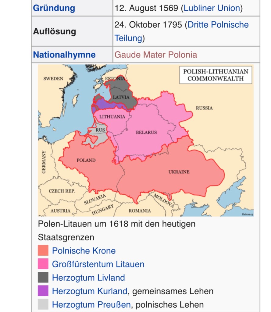 Putin erklärt die Ukraine und Belarus ganz frech zum russischen Stammland und die tumbe deutsche Presse u.a. schlucken das. In Wahrheit war das Gebiet von 1569 bis 1795 Staatsgebiet der Königlichen Republik Polen-Litauen Das war ähnlich wie Österreich ein Staat mit vielen Völkern, Sprachen und Religionen dazu einer erstaunlich modernen Verfassung und einem gewählten König. Demokratie gab es allerdings nur für die Adligen ähnlich wie im übrigen Europa. Allerdings gehörte ein Streifen am Schwarzen Meer und die Krim zu Russland.