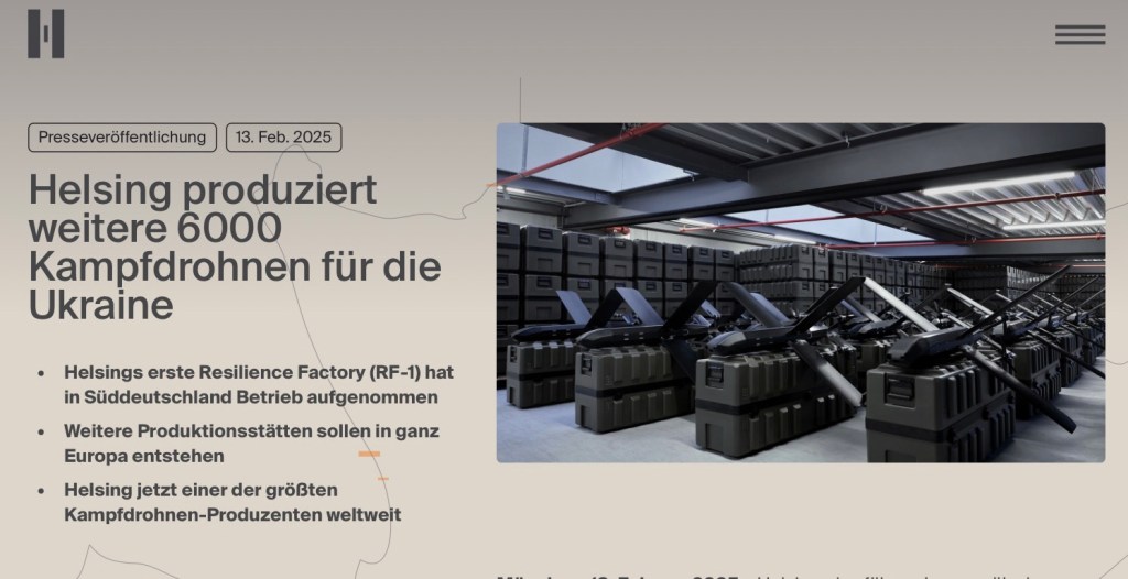 Helsing produziert und liefert 6000 Kampfdrohnen für die Ukraine in der Resilience Factory RF-1. Helsing liefert die hoch automatisierte Fabrikeinrichtung auch an Partner in der EU. Eine Fabrik in der Ukraine hat bereits 4000 Drohnen selbst gebaut und steuert exzellente Informatiker für das Projekt bei. Helsing nutzt u.a. die Grundlagentechnologie, die ursprünglich für Luft-Taxis in Bayern entwickelt wurde. Wichtig sind die Chips für Sensorik zur Zielerkennung und Prozessoren, die auch in Deutschland gefertigt werden können. Russland dagegen verfügt nicht über eine moderne IC Industrie und ist auf illegale Importe angewiesen.