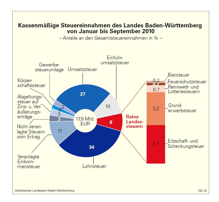 Die Steuereinnahmen der Länder hier als Beispiel Baden-Württemberg (Quelle Statistisches Landesamt Baden-Württemberg) verteilen sich auf folgende Steuerarten